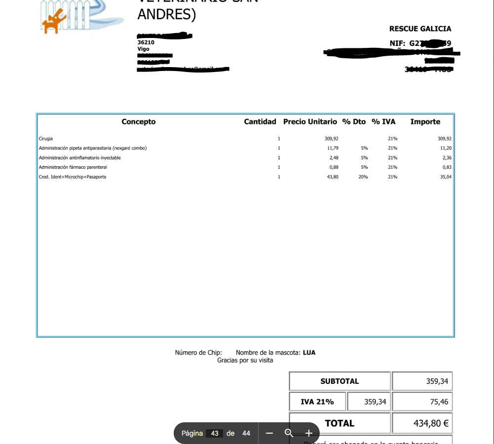 - La gatita que os contamos hace un mes que tuvimos que amputarle la patita han sido 434'80€, que por suerte se ha recuperado estupendamente y poco a poco va confiando más en su acogida.