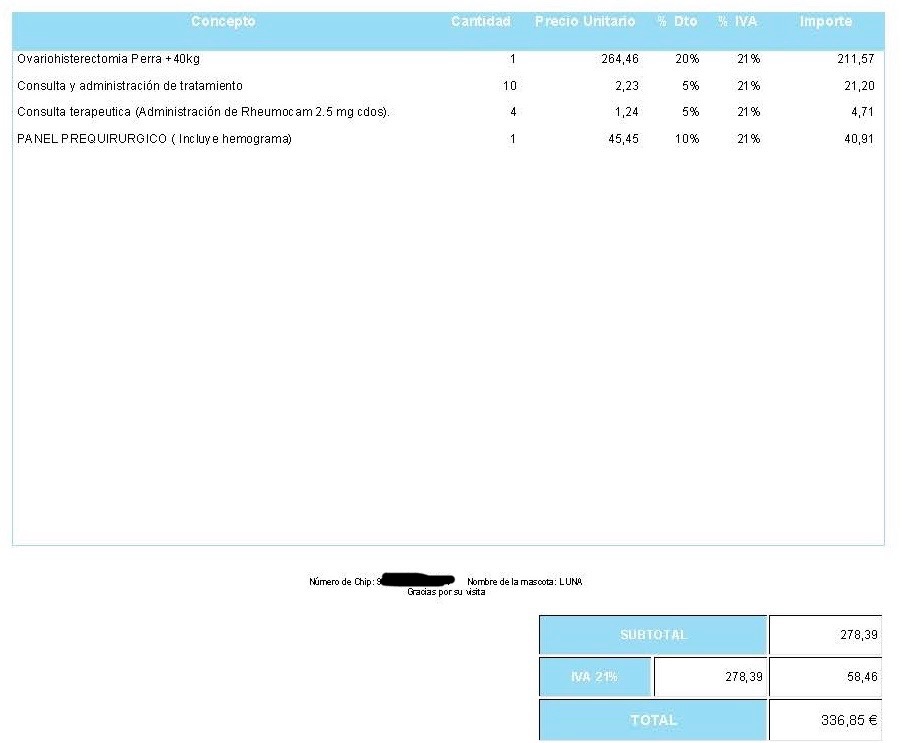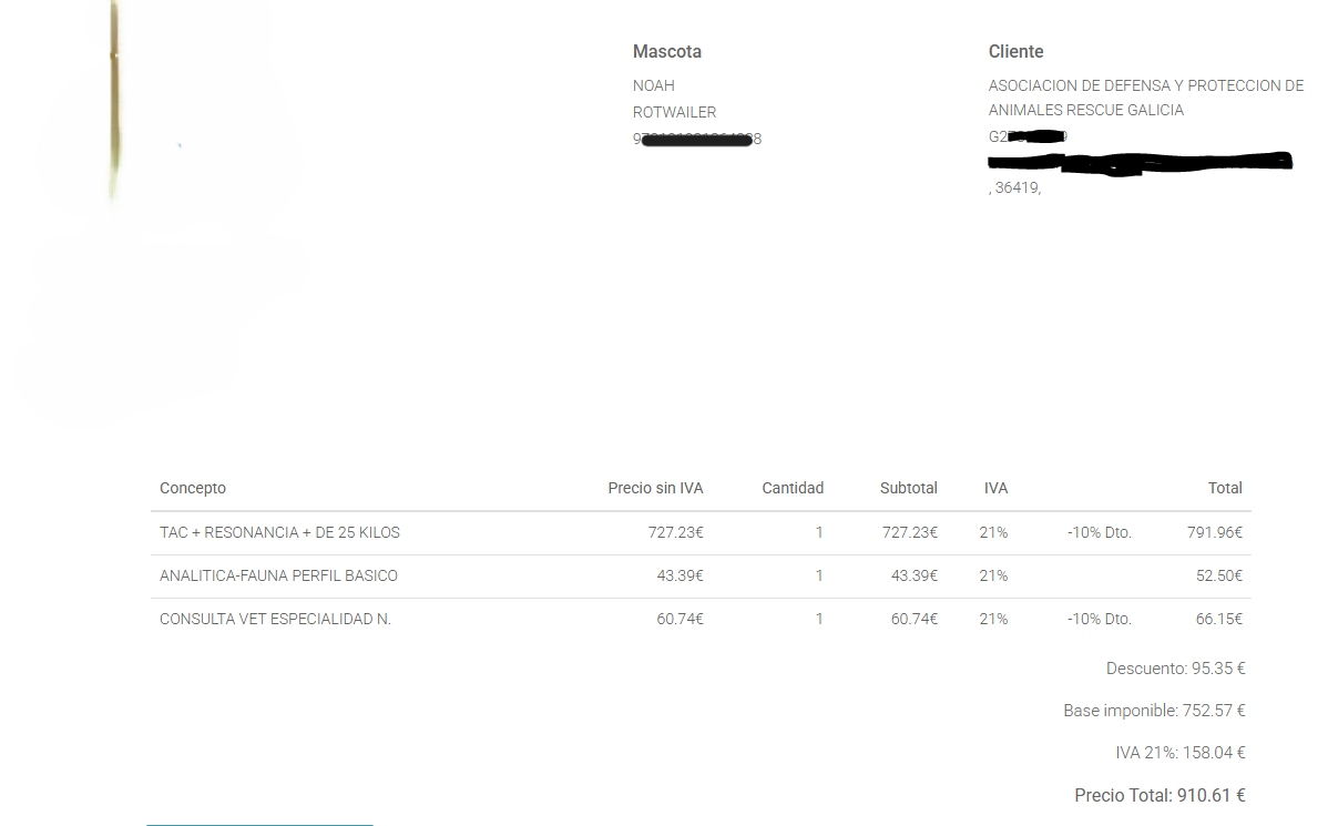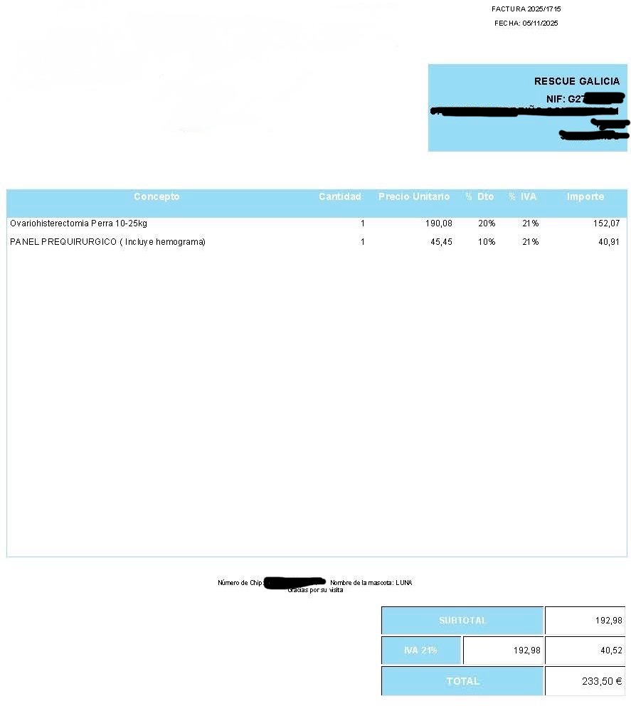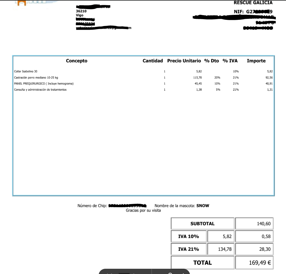- Hace unos días Noah empezó a hacer movimientos raros con las patas así que la llevamos a un especialista en neurología para que la valorara, al final resultó que tiene una hernia discal en las cervicales entre la C2 y C3, hemos tenido que hacerle un TAC y una resonancia que asciende a un total de 910'61€.
