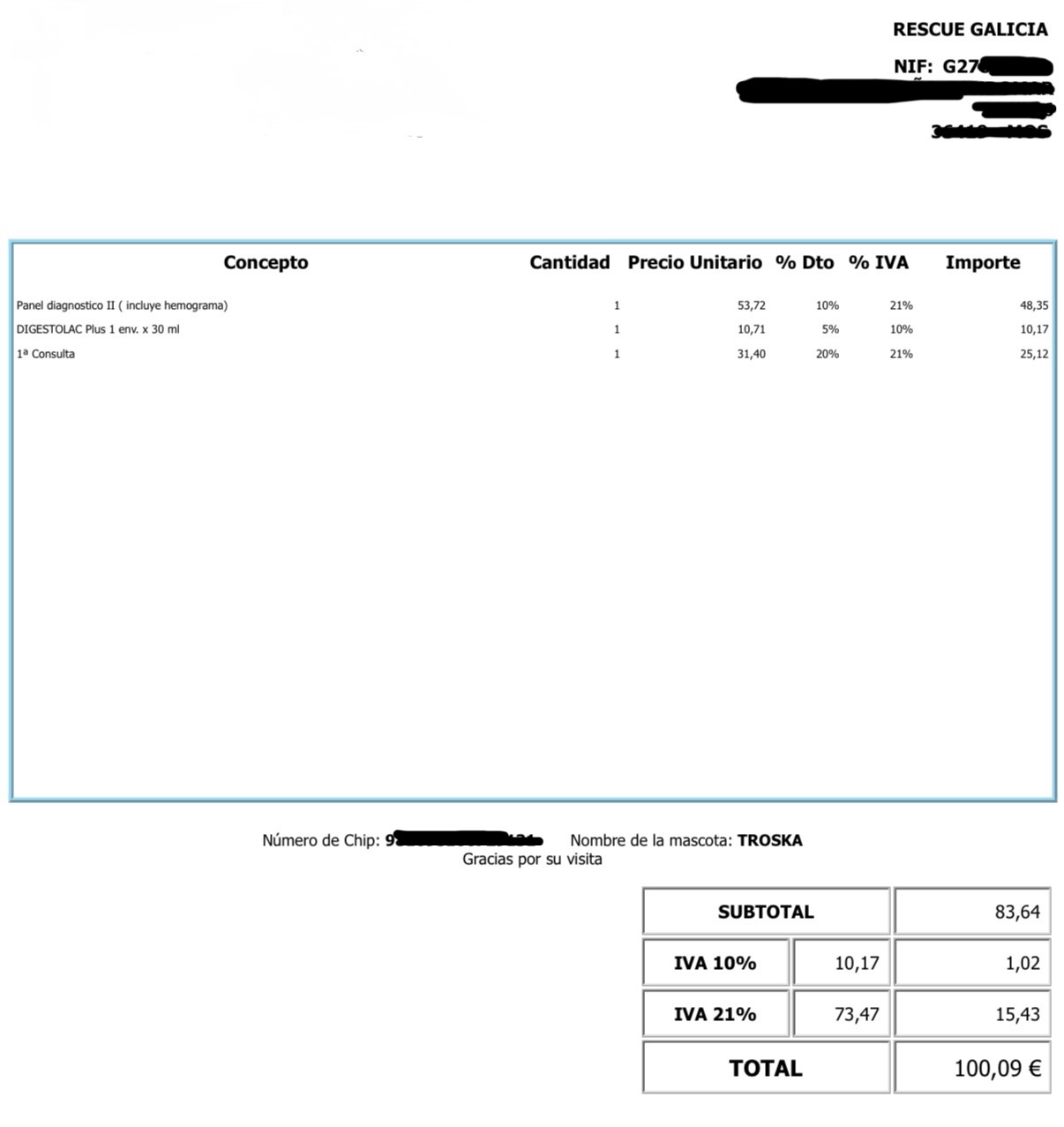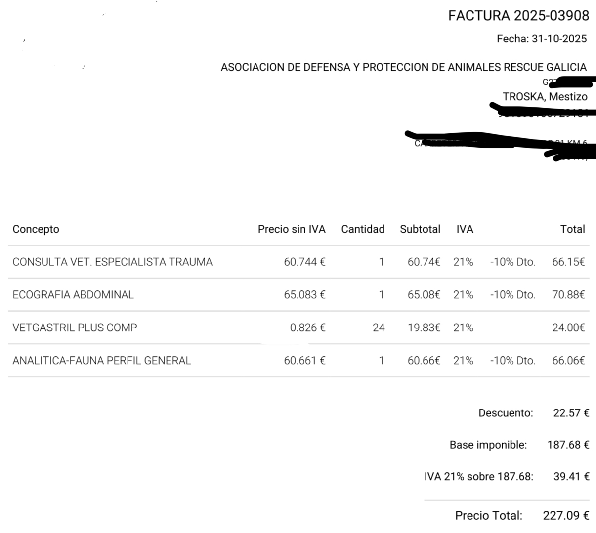 - También tuvimos que llevar a Troska porque aunque ya está con medicación para el dolor, esta no está siendo suficiente. Sumado a esto empezó con vómitos esporádicos, los vómitos parece ser algo funcional, así que vamos a probar con medicación antes de hacerle más pruebas, pero sus gastos fueron de 227'09€. Además de pruebas anteriores que habían sido 369'21€, haciendo un total de 596'30€.